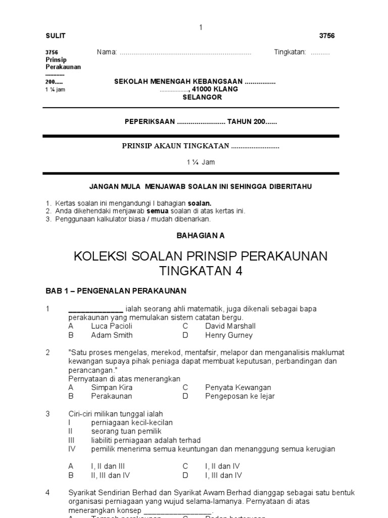 Contoh soalan akaun tingkatan 4 kertas 1 rim contoh soalan akaun tingkatan 4 kertas 1 sejarah contoh soalan akaun tingkatan 4 kertas 100. BAHAGIAN A KOLEKSI SOALAN PRINSIP PERAKAUNAN TINGKATAN 4 BAB 1 PENGENALAN PERAKAUNAN 1 _____ ialah seorang ahli matematik juga dikenali sebagai bapa perakaunan yang memulakan. Bahagian A 40 markah.